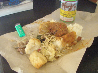 The next few days are spent walking around Kuta trying to get Carito straightened out with her diving trip she is taking, hanging out on the beach and trying to kick the ear infection. The ringing is unbearable and the pain is painful. Still, I am in Bali. So Carito gets dialed in to head up to Northern Bali where she is meeting a guy so while sitting on the beach I strike up a conversation with a guy from the Santa Cruz area who is here surfing and he tells me what I need to know to get the ferry over to Lombok and off to Lakey Peak, where I plan on staying for a while. Talk to some people there and maybe head to Timor. Well, cancel that. Carito is getting her stuff together and I can't for the life of me find my goddamned debit card. WTF? I just had it. I never put it down, ever. It is always in my back pocket. I value that thing more than my passport! Well, it's not here. I still have my credit card as backup, thank god. Carito and I head over to the local bank and I'll be damned if the freaking card didn't expire in 2006! I never use it and haven't ever looked at the...ah forget it. I cut that thing in half and I talked Carito into spending her last night getting me sorted out with her Skype account. Making a call here is totally expensive-.80-1.00 per minute and I know that calling Citibank is going to take a while. We got over to the internet cafe and I how wonderful! I connected right away with a helpful and caring Citibank operator who understood my plight and truly wanted to help! Oh happy day. Carito wisely brought along the card for the hotel so I gave the hotel address, phone number and even the hotel owners email address to the operator and she assured me that a new card was being sent out right then! She would personally put it in the mail and it would be there by Thursday. It was Monday night. Well, I checked my pockets and I still had about 11 bucks in Rupiah so hell. No problem. A couple days posted up in the room, eat cheap. No beers. I can wait it out. Carito offered to loan me some cash but I put up my hand and proudly declined. I can wait a couple days. She was off in the morning and I did the usual. Off to the small cafe down the street for a bannana pancake and some strong coffee. About 4 bucks. That leaves me 7 bucks. Have a 3 buck dinner and I'm down to 4 bucks. One day to go. Thursday comes. And Thursday goes. No card and not nearly enough money left to make a call to Citibank. The three guys that work at the desk are aware of my delimma so they offer to pick up some dinner when they go to get there own. The usual meal here morning, afternoon, and night is either nasi goreng: spicy rice with a small bit of chicken, mi goreng: spicy noodles with a small bit of chicken or nasi champur, my personal favorite: rice with some sauce, bit of chicken and a small piece of tofu. Sometimes you get a little piece of eggplant if a piece accidentally gets caught up with the other stuff as the cook puts it together. The meal is wrapped up in a folded piece of construction paper and you eat with your hands. Mi goreng costs 5k rupiah, or 50 cents, nasi champur costs 75 rupiah, or 75 cents. I got down with the nasi champur. I also bought a can of melon juice with a rhinocerous on it. It tastes exactly like fresh honeydew melon. There is a photo of both. Well, Friday passes. I get one meal. Saturday passes. I get one meal. Sunday passes. I get one meal. Still no card. I pool all of my money and I have just over one dollar left. I head out to the internet cafe and get the number for Citibank. I then go to a couple local vendors and find one who will let me use their phone to call a toll free number. The next ten minutes I spent trying to convince the citibank employee that I was on a borrowed phone and she had typed my password in wrong, transposing two letters. If I could have reached thru the phone, I swear to god. I finally convinced the lady and she put me on hold. What? AAAAAAAAH! All the while the phone's owner is trying to get me to give her the phone back but I am almost there. They are going to tell me where the card is! Almost there! 5 minutes later the lady gets back on the phone to tell me that the address I gave her was incorrect and that UPS tried twice to deliver but could not. "Where is the card now?", I ask. "I don't know", she replies. "What do I do now?", I ask. "I can't tell you", she replies. I'm beside myself at this point. After I explain to her what a shitty situation I am in, she asks me if I want the tracking number. No. I don't want any possible solution to my problem. What's wrong with you lady? I get that out of her and hang up. I hand the phone back to the lady, who is visibly upset. I thank her profusely and make my way back to the internet cafe. 30 cents to use the internet long enough to get the address of UPS in Denpasar, where my card MIGHT be. No dinner that night. Monday morning rolls around and I head out to the road to get a motorbike driver to take me to the Denpasar office. Problem is I only have 10,000 rupiah left, or $1.00. It's past the airport and when I got here, it cost me 3 bucks just to get into town from there one way. I'm needing a round trip ticket here. I finally find a guy who is willing to take me. I don't think he knows how far it is and if I get the card from this office, which is no guarantee, I plan on kicking this guy some extra. Can't make that promise, though. This is my last buck. Were off and 30 minutes later we pull up to the UPS office. Up to the counter and I show my tracking number. The lady shrugs her shoulders and walks into the back. I follow her to the doorway and watch as she digs into a big pile of boxes. I'm looking for a credit card here. After a few minutes she reaches the bottom of the pile and pulls out an envelope with my name on it! Bastard! I have a look and the stupid Citibank operator didn't put the complete address. Whatever. I take out the card and try it in the closest atm. Nope. A second atm. No 